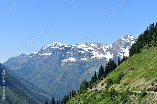 Going-to-the-Sun Road Overlooking a Valley Surrounded by Snow Dusted Mountains, Glacier National Park, Montana