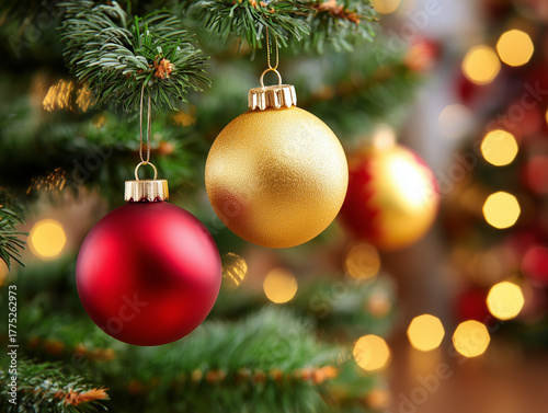 Gold and red christmas ornaments on festive tree. close up christmas baubles with holiday lights