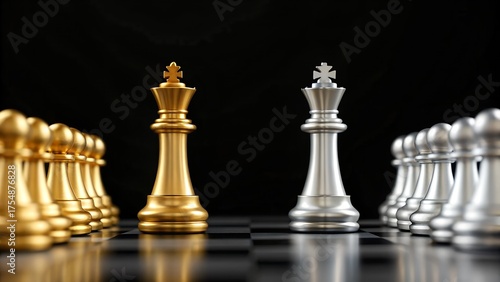 Gold And Silver King Chess Pieces Facing Each Other On A Chessboard With Pawn Lineup Detailed Macro Shot