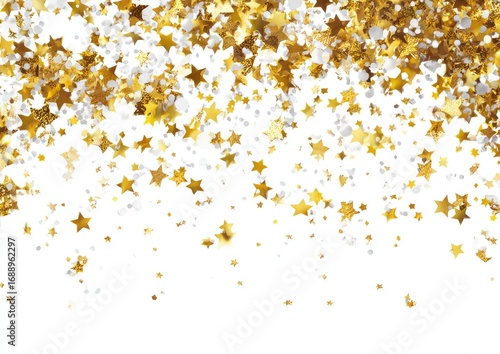 confetti, star, gold, white, glistering, sparkle, celebration, festive, party, holiday, decor, background, pattern, texture, shiny, bright, glamourous, luxury, celebratory, design, border, decoration, image, graphic, digital, art, isolated, sprinkle, scattered, falling, metallic, shimmering, abstract, event