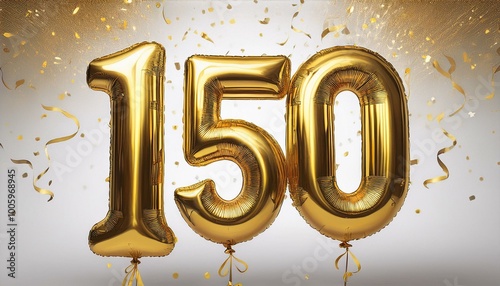Gold birthday / anniversary balloon, number 150, white background with confetti