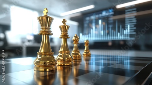 Gold chess pieces on a chessboard in a modern office setting, strategic planning, business growth.