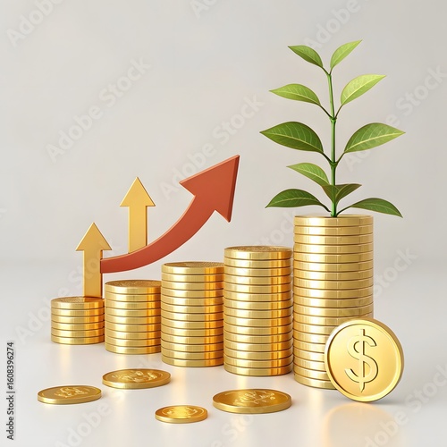 Gold coins and stacked stairs leading to an upward arrow, representing economic growth and wealth accumulation.
