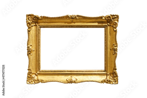 Gold frame for a picture in a classic baroque style on a white blank background.
