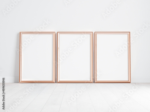 gold frame mockup, three vertical gold frames, poster frame, mockup for art, minimalist gold frames, 3d render