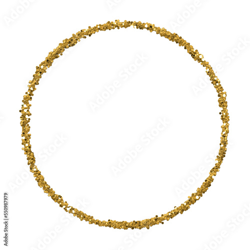 Gold glitter textured frame, isolated stationary circular element for a wide range of projects. Abstract gilded glitter sparkling particles for embellishment.