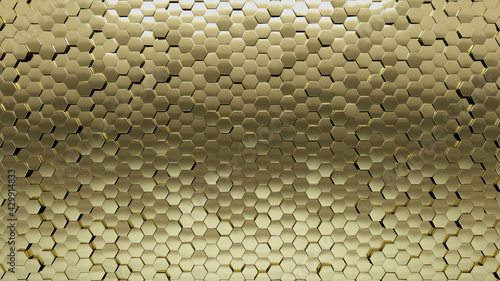 Gold, Glossy Mosaic Tiles arranged in the shape of a wall. Polished, Hexagonal, Bullion stacked to create a 3D block background. 3D Render