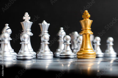 Gold king chess piece face another silver team on black background (Concept for leadership, problem or crisis situation)