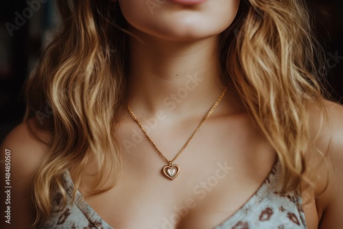 Gold necklace with heart pendant on woman's neck