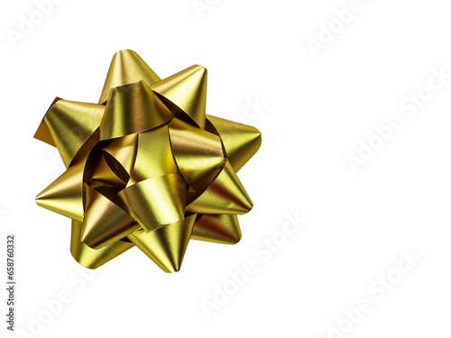 gold neon foil bow, Ribbon bow for decoration, gift in the holiday season, Top view, isolated on white background.