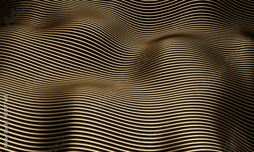 Gold parametric structure. Abstract lines. Dark background. Wavy surface. 3d rendering.