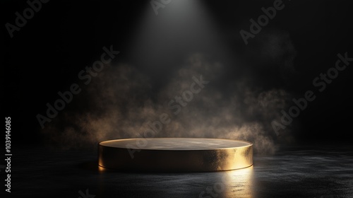 Gold podium pedestal on black background with smoke illuminated by spotlight. Mockup for product presentation