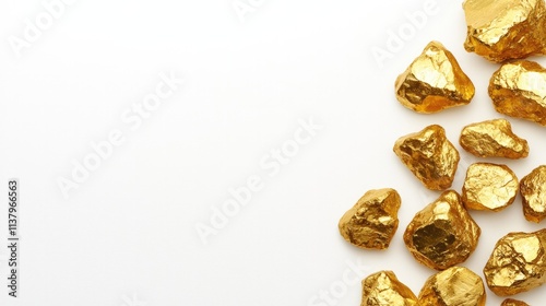 Gold price investment concept. Gold nuggets scattered on a white background, showcasing their natural texture and shine.