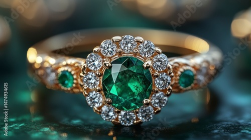 ring, gold, gemstone, emerald, diamond, jewellery, elegant, sparkle, luxury, adornment, round, brilliant, precious, gem, vibrant, green, white, shiny, detail, ornate, design, beautiful, expensive, treasure, glimmer, blur, bokeh, sharpened, texture, surface, light, shadow, macro, closeup, intricate, timeless, classic, refined, glamour, sophistication, celebration, gift, engagement, wedding, anniversary, proposal, love, romance