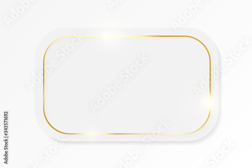 Gold shiny glowing vintage frame on whte plate isolated on white background. Golden luxury realistic border. Wedding, mothers or Valentines day concept. Xmas and New Year paper abstract