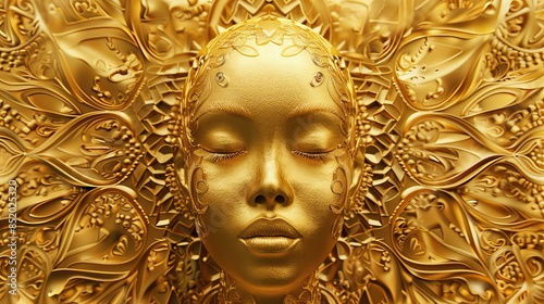 Gold statue of a woman with a mandala background. Glamour and beauty woman portrait gold. High quality AI generated image