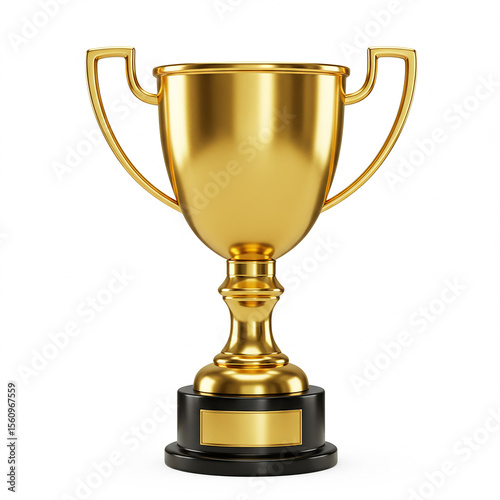 Gold trophy cup on a black pedestal isolated on white. Symbol of victory and success.