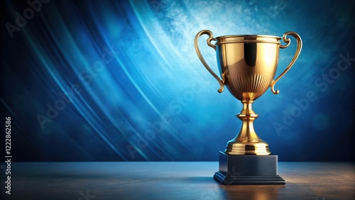 Gold trophy on blue background with intricate details and textures, award ceremony