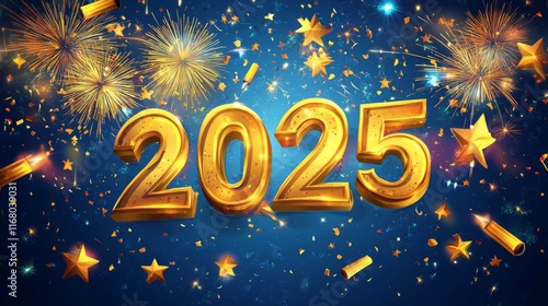 2025, gold, fireworks, new year, celebration, dark blue, gold, festive, hi-res, illustration, high-quality, detailed, holiday, design, text, vibrant, event, party, bright, graphic design, colourful, new year's eve, cheerful, sparkling, explosion, confetti, joyful, seasonal, anniversary