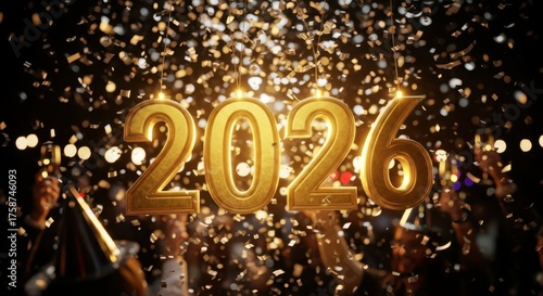 Golden 2026 balloons amidst sparkle confetti celebration new year's eve party