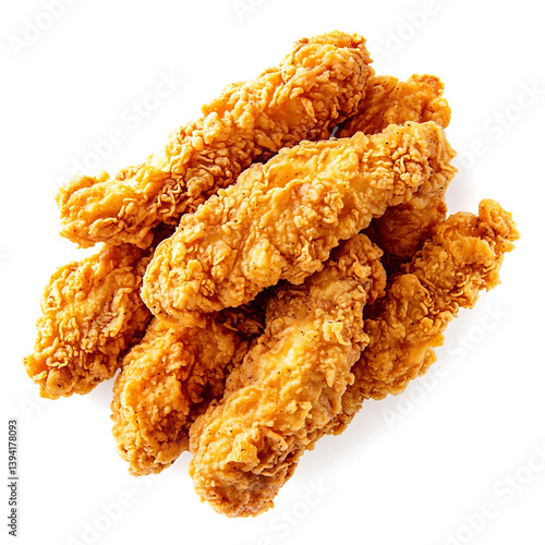 Golden and crispy chicken fingers with a perfectly fried crust and tender meat inside, isolated white background, modern art style