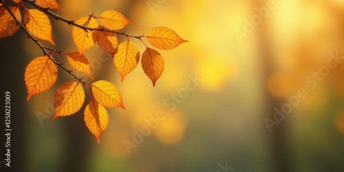Golden autumn leaves backlit by warm sunlight on a branch