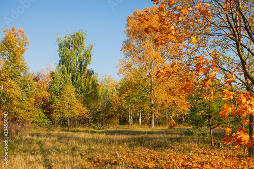 Golden autumn trees. Beautiful autumn meadow in the park or forest. Sunny autumn landscape.