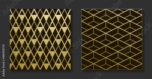 Golden backgrounds set. Shiny Gold geometric textures on black background. Vintage vector illustration. Bright backdrop for christmas cards, luxury flyers or banners. Vector illustration