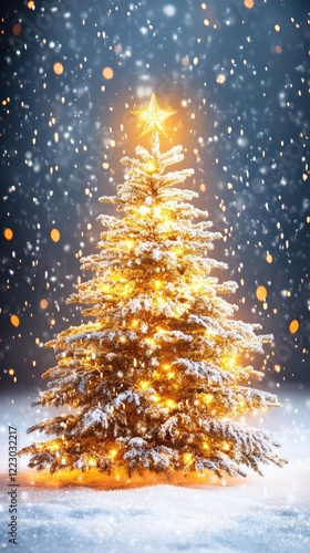 Golden baubles and fairy lights on christmas tree with snowflakes