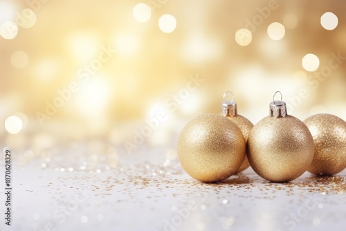 Golden baubles placed on a glittery surface celebrating the festive holiday season