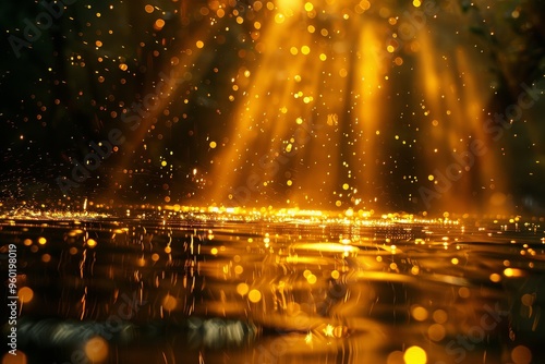 Golden beam of light reflecting on water surface, creating abstract flowing textures with a mysterious and tranquil atmosphere, impressionistic style.