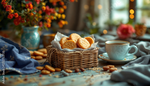biscuit, cookie, basket, wicker, tea, cup, autumn, fall, floral, flower, still, life, photo, food, gold, rustic, warm, cosy, tranquil, mood, delicious, snack, sweet, tasty, texture, light, composition, vintage, style, homely, comfort, product, marketing, commercial, image, detail, natural, scene, table, background