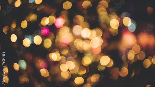 Golden bokeh lights glowing softly on dark background, warm abstract festive texture for celebration or Christmas design