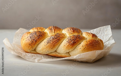 Golden braided bread sprinkled with poppy seeds rests on parchment paper against a neutral gray background. The bread is freshly baked and shows a slightly textured surface