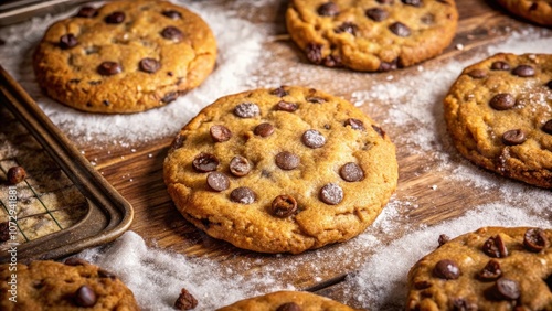 Golden Brown Chocolate Chip Cookies on a Wooden Surface with a Sprinkle of Powdered Sugar