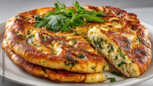 Golden brown frittata with a fluffy texture is plated attractively, featuring vibrant green herbs and melted cheese. Fresh parsley adds a touch of color to the dish.