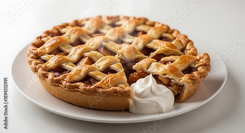 Golden Brown Lattice Top Apple Pie with Cream on White Plate