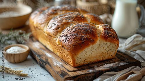 Golden brown loaf of bread with poppy seeds placed on a wooden board in soft morning light, showing freshness and homemade quality.