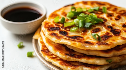 Golden Brown Pancakes with Green Onion Garnish Served with Sauce