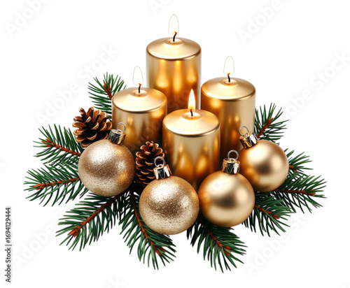 Golden Candles with Pine Cones and Baubles on Transparent Background, 3D Realism Holiday Centerpiece