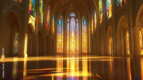Golden Cathedral Interior with Vibrant Stained Glass Windows