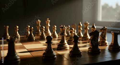 Golden chess pieces on a wooden board bathed in sunlight strategy and competition in a classic game
