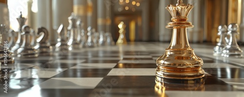 Golden chess queen standing prominently among silver pieces on a chessboard, representing leadership, strategy, and success