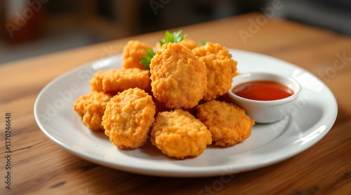 Golden Chicken Nuggets on Plate with Red Sauce Dip Side Dish
