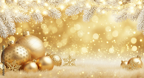 Golden Christmas ornaments on a festive background with bokeh effects and copy space