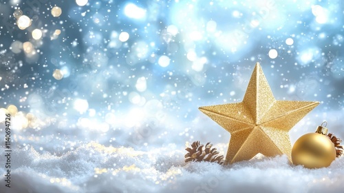Golden Christmas star and ornaments on a snowy background with bokeh light effects