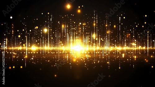 gold, light, city, city landscape, abstract, digital, art, background, design, texture, sparkle, glistering, shine, glow, bright, aglow, gold, illumination, radiance, night, dark, black, bokeh, dot, circle, pattern, line, vertical, horizontal, surface, futuristic, technology, modern, elegant, luxury, shimmer, vibrant, energy, dynamic, ambience, atmosphere, scene