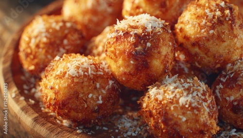 ball, coconut, crispy, gold, sweet, food, dessert, baked, round, delicious, treat, plate, wooden, closeup, texture, food photography, snack, pile, flocked, baked goods, carb, energy, healthy, unhealthy, vegan, vegetarian, homemade, tasty, cocoa, brown, light, sunlit, close, surface, natural