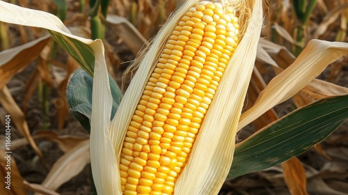 golden corn cob nestled in green leaves surrounded by a vast cornfield ready for harvest under a clear sky
