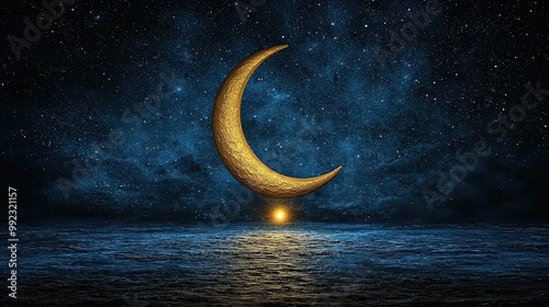 Golden Crescent Moon Over Night Ocean with Stars